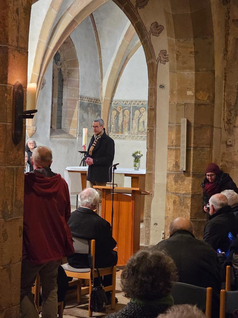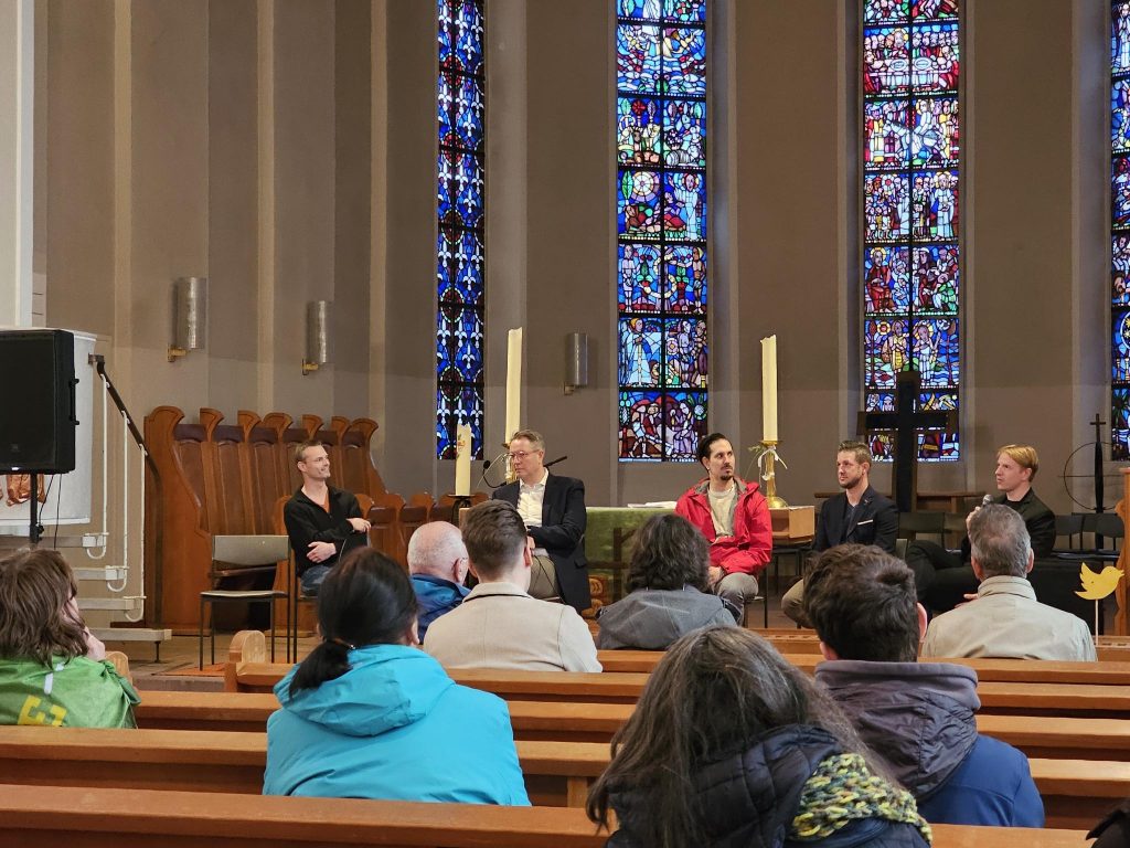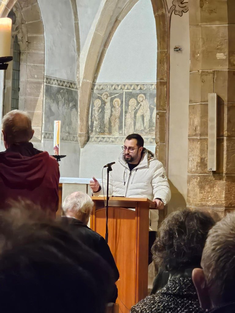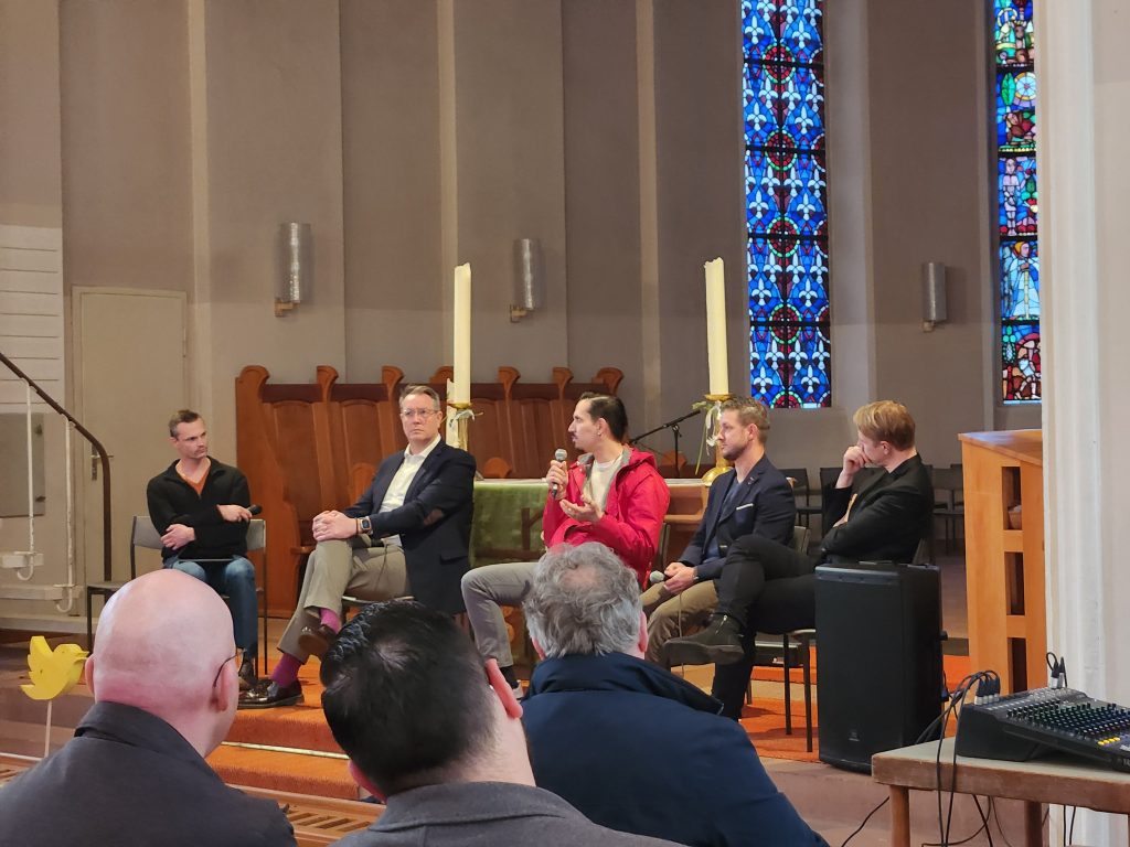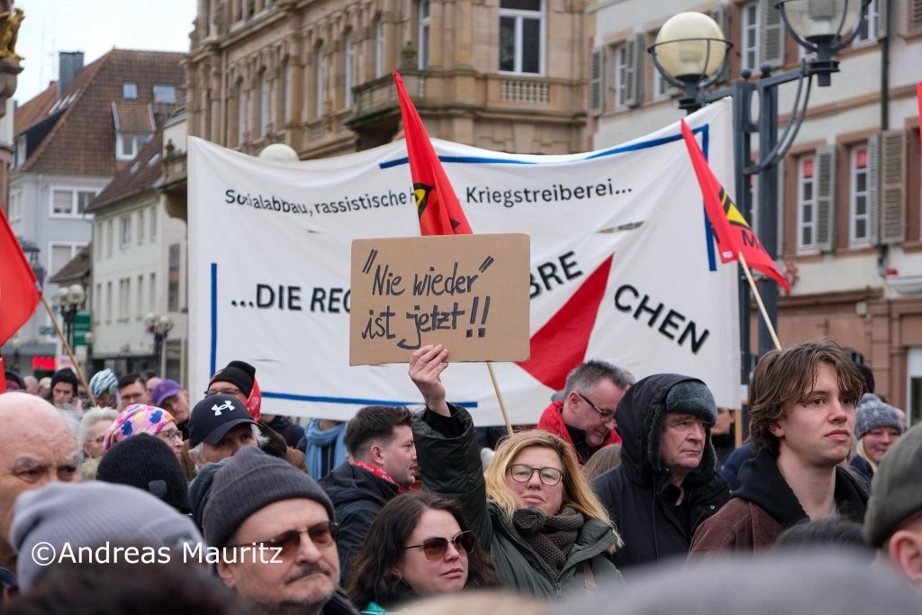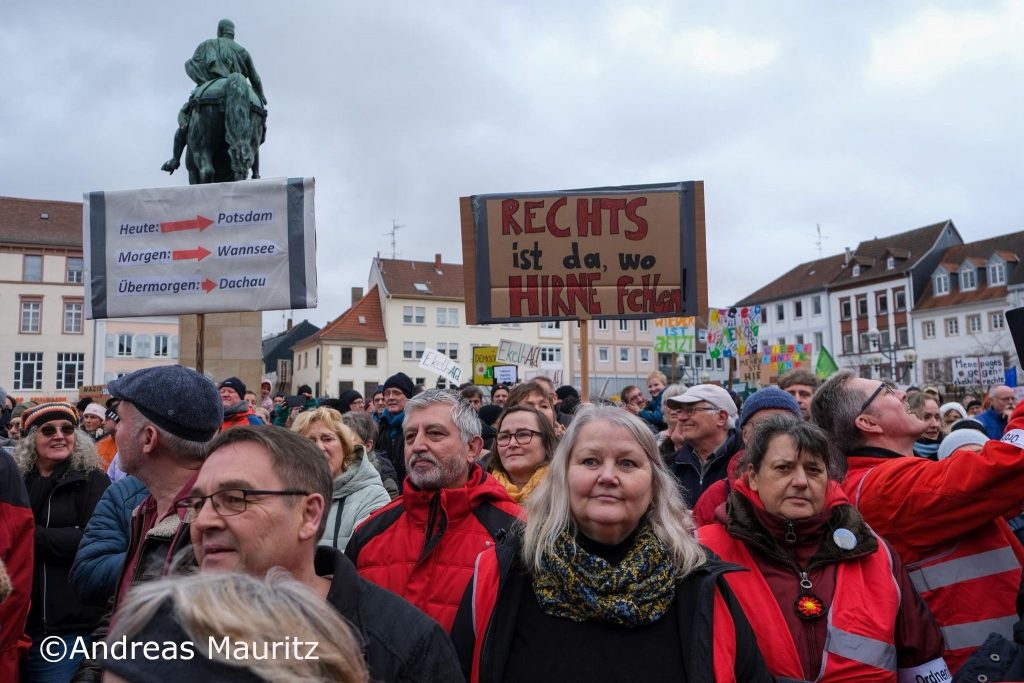 Bei der abschließenden Kundgebung vor der evangelischen Kirche betonte die Versammlungsleitung wie wichtig es ist nicht nur einmalig zu demonstrieren, sondern jeden Tag die rechte Welle zu brechen. Anhand eines persönlichen Beispiels wurde gezeigt, wie steter Tropfen den Stein höhlt und Menschen aus den Händen der Parolen rechter Rattenfänger befreit werden können. Anschließend ging es weiter in der Kirche. Nach der Gründung des neuen Annweilrer Vereins „Menschenwürde, Toleranz und Demokratiebildung Annweiler“ diskutierten in zwei Runden zuerst Vertreter aus der Zivilgesellschaft und anschließend Vertreter der Kommunal- und Landespolitik auf dem Podium zum Thema „Krise der Demokratie? Weltweite Krisen und deren Auswirkungen auf das politische Handeln“, moderiert on unserem Verstandsmitglied Björn Eisenmann
