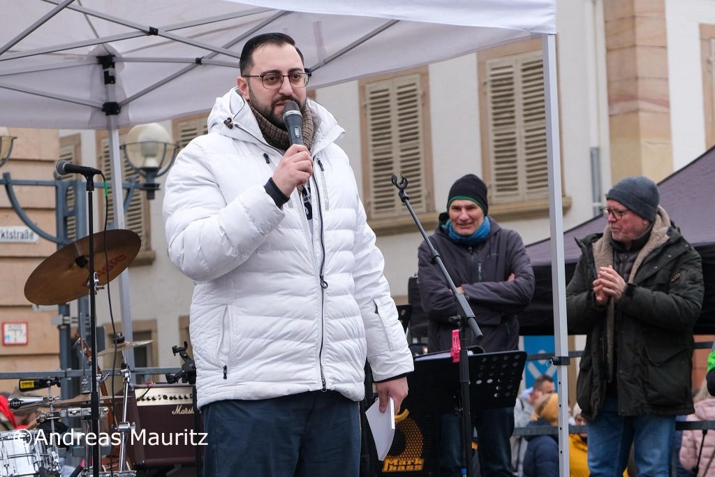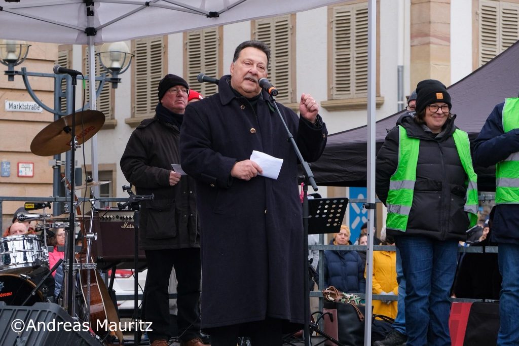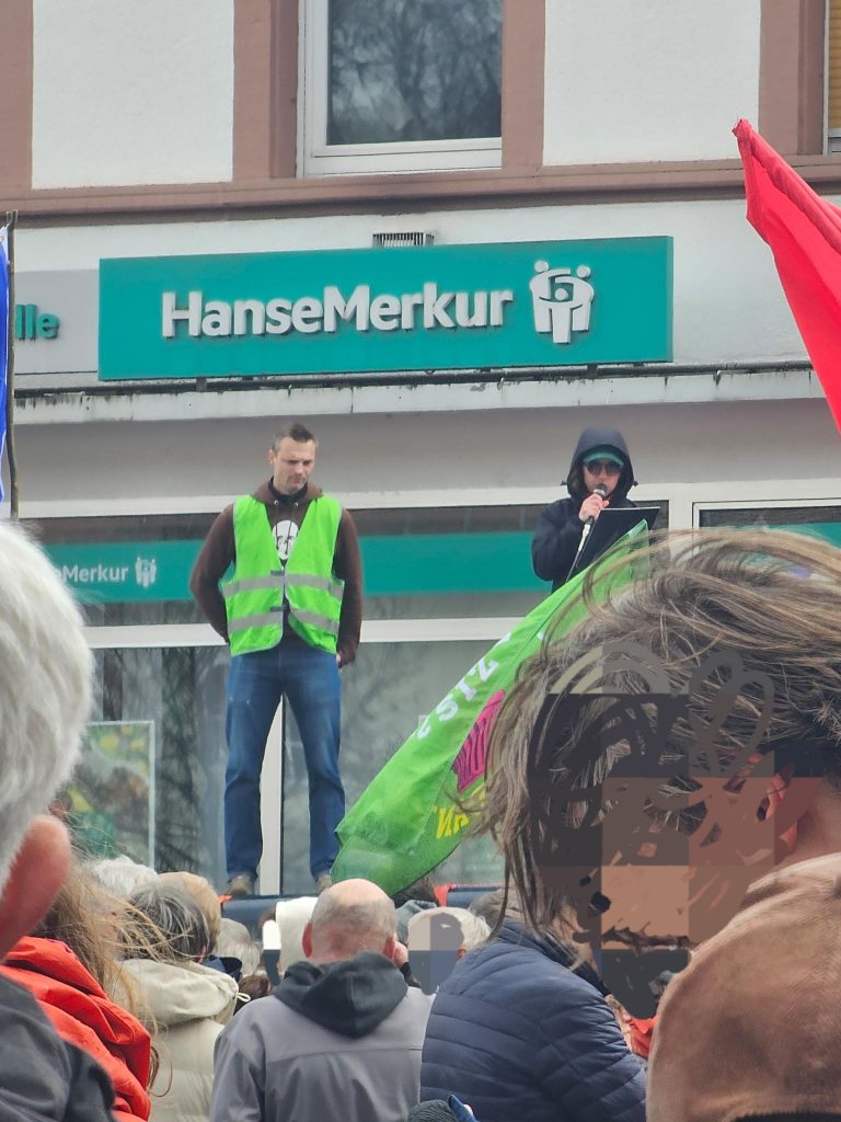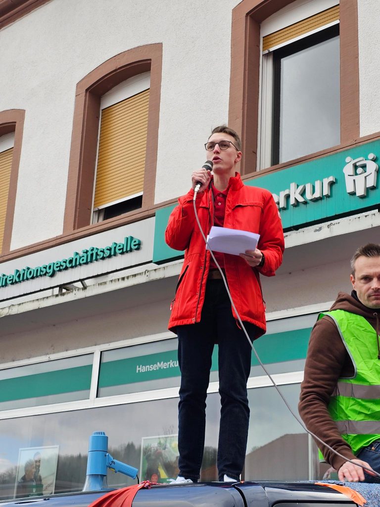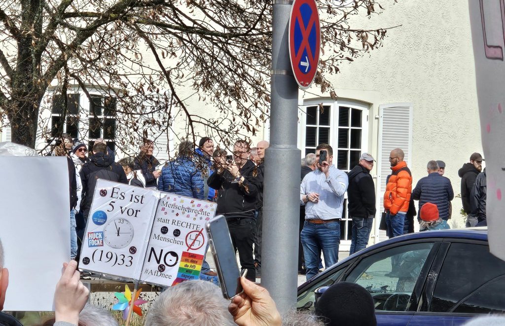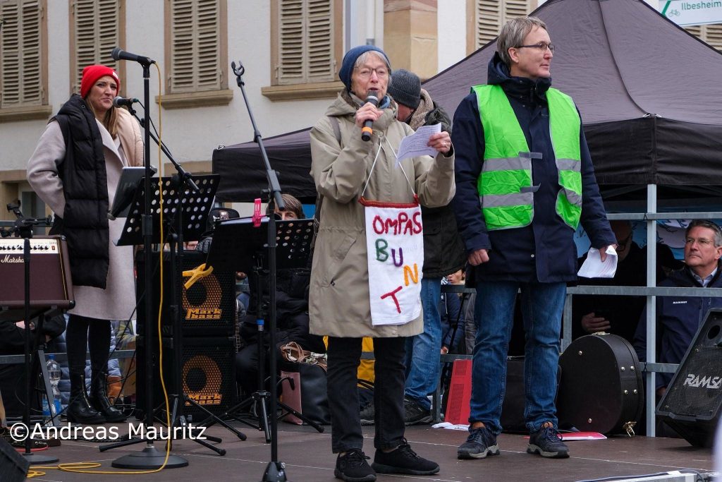 Mit der Eröffnung und der Begrüßung durch unsere erste Vorsitzende Tanja, Sebastian von ver.di und unserem Bündniskoordinator Björn machten wir von Anfang an deutlich, was der Konsens des Tages sein wird: Wir sind laut, wir sind bunt, wir sind solidarisch und wir sind friedlich. Dies fand bei den Menschen, die in Annweiler zusammenkamen, breite Annahme. Menschen auf der Kundgebung waren bunt durchmischt: Annweilerinnen, die sich gegen rechte Hetze in ihrer Stadt stellten, Gewerkschaften, Lokalpolitikerinnen, Kirchen, die Omas gegen Rechts, das Offenen Antifaschistischen Treffen Landau und weitere, Antifaschistinnen bilden einen stellvertretenden Ausschnitt der Breite des Teilnehmenden. Zu unserer großen Freude bezogen die Menschen lautstark vor dem Hohenstaufensaal Stellung gegen Rechts. Offensichtlich war das für Tino Chrupalla schon ausreichend um sich, wie wir Presseinformationen entnehmen konnten, durch einen Keller hat in den Hohenstaufensaal eskortieren zu lassen. Nachdem wir alle gemeinsam dem Stadtrat der kleinen Stadt Annweiler und der Stadtspitze für ihren Mut, bis zuletzt wie “Löwenbezwinger” gekämpft zu haben, lauten und donnernden Applaus spendeten richtete Benjamin Burckschat, der erste Beigeordnete ein Grußwort die Menschen, die zusammengekommen waren. Ihm folgte ein kurzer Redebeitrag von Christiane Huber aus dem Stadtrat, stellvertretende Fraktionsvorsitzende der lokalen SPD-Stadtratsfraktion. Ein Antrag aus ihren Reihen sorgte dafür, dass die Stadt sich gegen die Vereinnahmung der in weiten Teilen rechtsextremen Partei erhob. Pfarrer Thomas Lang erinnerte daran, dass Hass nie gut sei. Einen emotionalen Höhepunkt Setzte Sabine von den Omas gegen Rechts, die sich mit ihre über 80 Jahren nicht zu schade war und keine Mühe scheute, um sich auf den Kleintransporter des AStA Landau zu quälen, der als Bühne diente. Von dort berichtete sie eindrucksvoll unter anderem von ihren eigenen Fluchterfahrungen zu berichten. Anschließend hatte David Rosenberg, der in der Vorwoche nur eingespielt werden konnte, das Wort. Als Vorsitzender des jüdischen Studierendenverbands Hinenu Rheinland-Pfalz und Saarland gab er uns einen Einblick in die jüdische Perspektive. Dass die Gewerkschaften jeglichen Widrigkeiten trotzen, demonstrierte Nils von der IG BCE. Trotz einsetzenden Sturms, kurzzeitigem Starkregens und Hagels ergriff er das Wort und betonte, wie Sozialabbau die Rechten beflügelt. Nach ihm hielt eine Aktivistin des OAT Landaus ihren Redebeitrag in dem Sie unter anderem auf Polizeigewalt und juristische Repressionen gegen Linksaktivistinnen aufmerksam machte und die Politik der Ampelregierung aber auch der Unionsparteien, wie bereits ihr Vorredner, kritisierte. Während ihres Vortrages kam es zu Störungen und Zwischenrufen, von denen wir uns als Verein für Toleranz und Menschlichkeit Südpfalz distanzieren. Demokratischer Diskurs kann nur unter Einhaltung einfachster Regeln des gesellschaftlichen Miteinanders funktionieren. Forderungen einer Rednerin das Mikrofon auszuschalten, lautstarkes überbrüllen, gehören hier ganz klar nicht dazu. Wir verurteilen solches Verhalten klar und distanzieren uns hiervon deutlich! Selbstverständlich werden wir die Vorkommnisse aufarbeiten, um in Zukunft besser darauf reagieren zu können. Gleichzeitig möchten wir betonen, dass es Menschen gab, die sowohl auf uns als auch auf die Aktivistin zukamen, um das Gespräch zu suchen und in einen konstruktiven Dialog gingen. Wir ermutigen Menschen so zu handeln. Demokratie heißt verschiedene Meinungen zu haben, darüber zu reden, ja auch zu streiten aber bitte in einem konstruktiven Rahmen. Abschließend machte Silke als Verdi-Vertreterin in ihrem Redebeitrag deutlich, warum die AfD eben keine Partei für „kleine Menschen”, keine Partei für Arbeiterinnen ist.