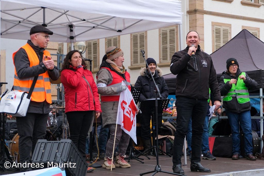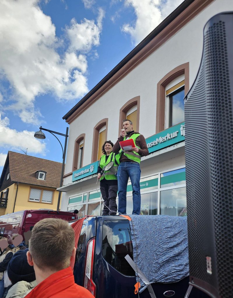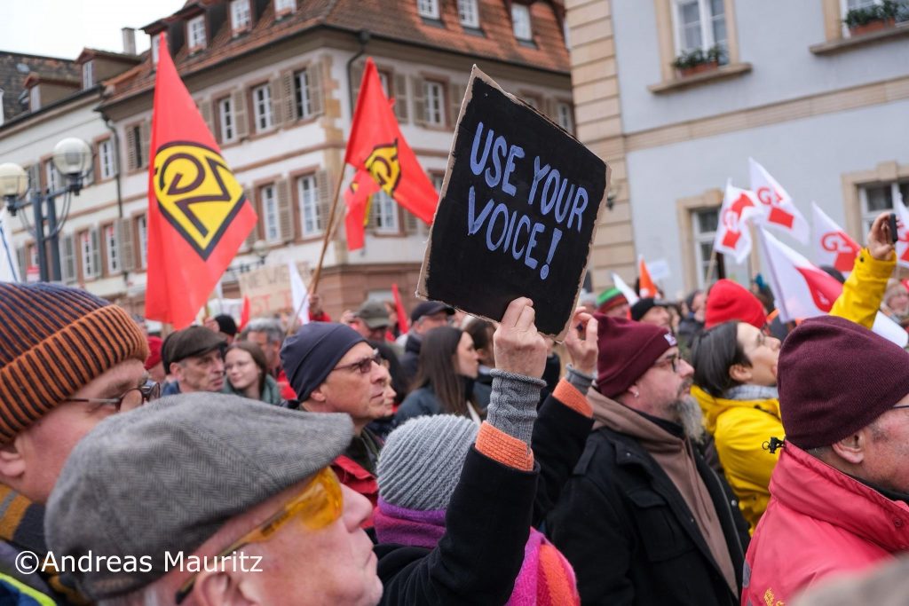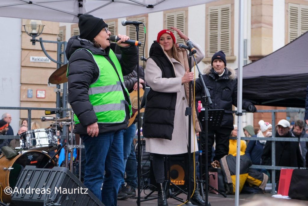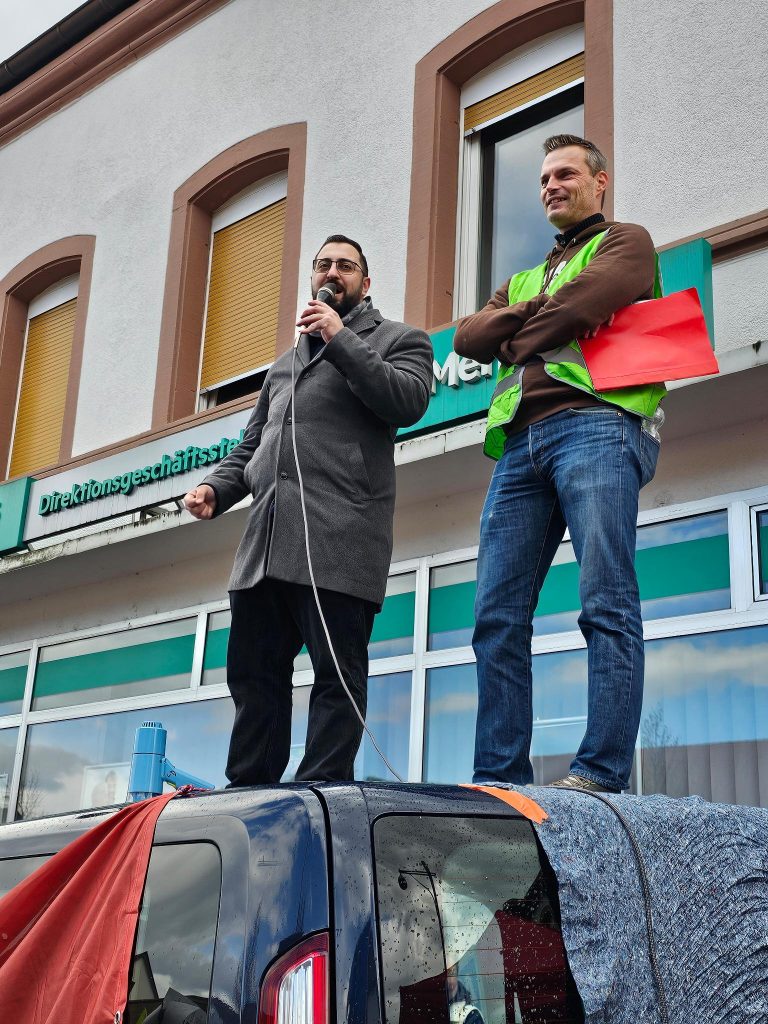 Mit der Eröffnung und der Begrüßung durch unsere erste Vorsitzende Tanja, Sebastian von ver.di und unserem Bündniskoordinator Björn machten wir von Anfang an deutlich, was der Konsens des Tages sein wird: Wir sind laut, wir sind bunt, wir sind solidarisch und wir sind friedlich. Dies fand bei den Menschen, die in Annweiler zusammenkamen, breite Annahme. Menschen auf der Kundgebung waren bunt durchmischt: Annweilerinnen, die sich gegen rechte Hetze in ihrer Stadt stellten, Gewerkschaften, Lokalpolitikerinnen, Kirchen, die Omas gegen Rechts, das Offenen Antifaschistischen Treffen Landau und weitere, Antifaschistinnen bilden einen stellvertretenden Ausschnitt der Breite des Teilnehmenden. Zu unserer großen Freude bezogen die Menschen lautstark vor dem Hohenstaufensaal Stellung gegen Rechts. Offensichtlich war das für Tino Chrupalla schon ausreichend um sich, wie wir Presseinformationen entnehmen konnten, durch einen Keller hat in den Hohenstaufensaal eskortieren zu lassen. Nachdem wir alle gemeinsam dem Stadtrat der kleinen Stadt Annweiler und der Stadtspitze für ihren Mut, bis zuletzt wie “Löwenbezwinger” gekämpft zu haben, lauten und donnernden Applaus spendeten richtete Benjamin Burckschat, der erste Beigeordnete ein Grußwort die Menschen, die zusammengekommen waren. Ihm folgte ein kurzer Redebeitrag von Christiane Huber aus dem Stadtrat, stellvertretende Fraktionsvorsitzende der lokalen SPD-Stadtratsfraktion. Ein Antrag aus ihren Reihen sorgte dafür, dass die Stadt sich gegen die Vereinnahmung der in weiten Teilen rechtsextremen Partei erhob. Pfarrer Thomas Lang erinnerte daran, dass Hass nie gut sei. Einen emotionalen Höhepunkt Setzte Sabine von den Omas gegen Rechts, die sich mit ihre über 80 Jahren nicht zu schade war und keine Mühe scheute, um sich auf den Kleintransporter des AStA Landau zu quälen, der als Bühne diente. Von dort berichtete sie eindrucksvoll unter anderem von ihren eigenen Fluchterfahrungen zu berichten. Anschließend hatte David Rosenberg, der in der Vorwoche nur eingespielt werden konnte, das Wort. Als Vorsitzender des jüdischen Studierendenverbands Hinenu Rheinland-Pfalz und Saarland gab er uns einen Einblick in die jüdische Perspektive. Dass die Gewerkschaften jeglichen Widrigkeiten trotzen, demonstrierte Nils von der IG BCE. Trotz einsetzenden Sturms, kurzzeitigem Starkregens und Hagels ergriff er das Wort und betonte, wie Sozialabbau die Rechten beflügelt. Nach ihm hielt eine Aktivistin des OAT Landaus ihren Redebeitrag in dem Sie unter anderem auf Polizeigewalt und juristische Repressionen gegen Linksaktivistinnen aufmerksam machte und die Politik der Ampelregierung aber auch der Unionsparteien, wie bereits ihr Vorredner, kritisierte. Während ihres Vortrages kam es zu Störungen und Zwischenrufen, von denen wir uns als Verein für Toleranz und Menschlichkeit Südpfalz distanzieren. Demokratischer Diskurs kann nur unter Einhaltung einfachster Regeln des gesellschaftlichen Miteinanders funktionieren. Forderungen einer Rednerin das Mikrofon auszuschalten, lautstarkes überbrüllen, gehören hier ganz klar nicht dazu. Wir verurteilen solches Verhalten klar und distanzieren uns hiervon deutlich! Selbstverständlich werden wir die Vorkommnisse aufarbeiten, um in Zukunft besser darauf reagieren zu können. Gleichzeitig möchten wir betonen, dass es Menschen gab, die sowohl auf uns als auch auf die Aktivistin zukamen, um das Gespräch zu suchen und in einen konstruktiven Dialog gingen. Wir ermutigen Menschen so zu handeln. Demokratie heißt verschiedene Meinungen zu haben, darüber zu reden, ja auch zu streiten aber bitte in einem konstruktiven Rahmen. Abschließend machte Silke als Verdi-Vertreterin in ihrem Redebeitrag deutlich, warum die AfD eben keine Partei für „kleine Menschen”, keine Partei für Arbeiterinnen ist.